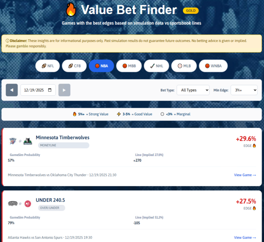 Find the best value bets by comparing simulation probabilities vs sportsbook lines