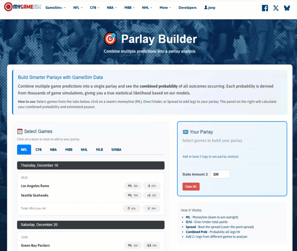 Build and analyze multi-game parlays using simulation probabilities